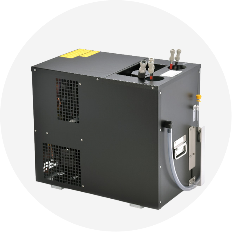 The AS 110 cooler features ice bank technology for high, continuous cooling performance and includes a 6 m agitator pump. Built with durable coated plastic, it offers easy service access and precise temperature control via thermostat.